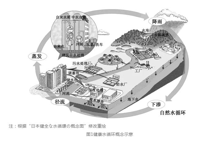 2014年至今,日本城市水系統進入了體系優化階段,這一階段最顯著的特點是健康水循環理念得到前所未有的重視,城市水系統工作從要素治理向系統綜合整治轉變。事實上,日本很早就開始重視水循環的重要作用,2000年制定的《全國綜合水資源計劃》(又稱“21世紀水計劃”)就提出了構筑可持續的用水體系,適應循環型社會發展的要求,但由于種種原因,這一理念在涉水工作發展進程中并未被完全落實。隨著日本經濟社會發展模式的轉變,人口老齡化和氣候變暖等多種因素的影響,加以城市水資源、水環境、水安全問題仍舊凸顯,日本的城市規劃建設者開始意識到城市水系統是城市復雜大系統的重要組成部分,涉及城市水資源開發利用、水環境治理保護、水安全保障提升等全要素全過程,局部的涉水工作難以解決整體問題,需要用系統的思維來認識和分析面臨的水問題,以城市為核心構建健康水循環才能實現城市水系統對經濟社會的永續支撐(見圖1)。