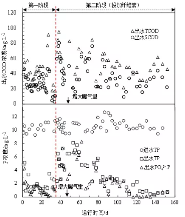 2.1 纖維素對cod與p去除的影響圖2顯示了小試裝置在整個試驗期間出水cod與磷濃度變化。在第一階段進水tcod濃度維持在450 mg/l時,出水tcod平均為(39.7±16.1)mg/l,其中scod為(24.8±10.8) mg/l,符合國家一級a排放標準。然而,當第二階段加入纖維素后,cod去除效果明顯惡化,出水tcod最高檢測值高達95 mg/l(scod為80 mg/l)。為探究加入纖維素后cod去除效果惡化原因,對出水tcod的構成進行了分析。結果顯示,加入纖維素后出水ss顯著下降,從(48.25±3.29) mg/l降至(21.34±9.71) mg/l,由此可排除污泥沉降性能惡化導致出水cod升高問題。纖維素富含官能團且呈線狀,因此其對污泥具有較好網捕卷掃作用,可促進污泥絮體凝結并提高其緊密度,這一現象通過污泥鏡檢也得到了印證。然而,不論是因纖維素自身作為cod消耗氧氣,還是導致污泥絮體變得緊密都有可能降低氧傳質,從而弱化了對cod的降解效率。為此,在第46 天對好氧池運行進行調整,將曝氣量提高至0.30~0.50 l/min(添加纖維素前為0.10~0.20 l/min)。結果,出水cod開始逐漸下降并恢復至投加纖維素前水平(tcod=49.4 mg/l,scod=34.2 mg/l)。可見,回收纖維素對曝氣池運行有著積極影響,可提高氧氣傳質與利用效率。